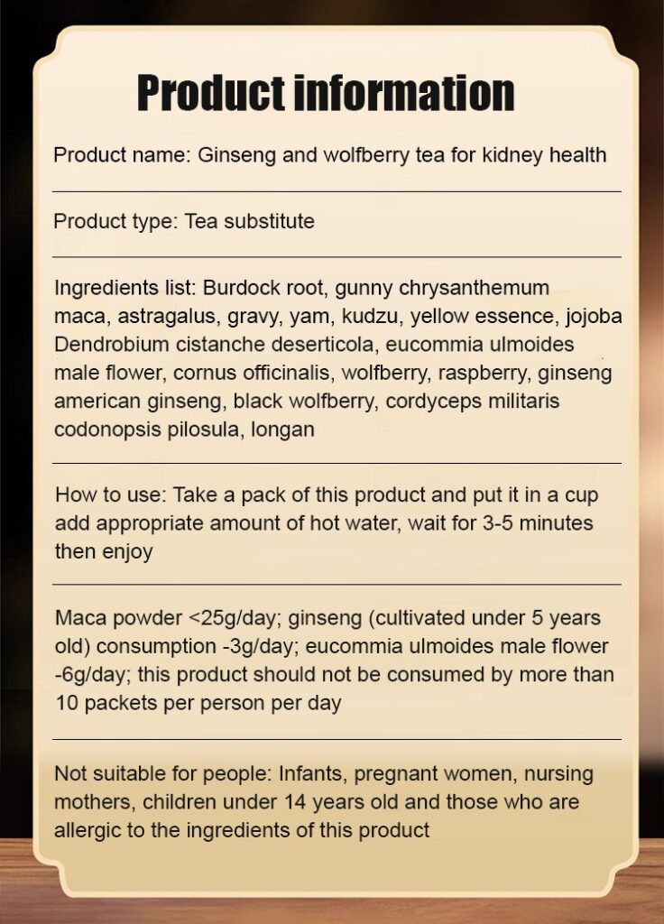 These ingredients are combined in scientifically determined proportions to ensure that each cup of tea provides optimal health benefits. This Ginseng Five Treasure Kidney tea has a smooth and gentle taste with a subtle herbal aroma. Suitable for those who often stay up late working, frequently drink a lot, and have liver problems and unhealthy lifestyle habits