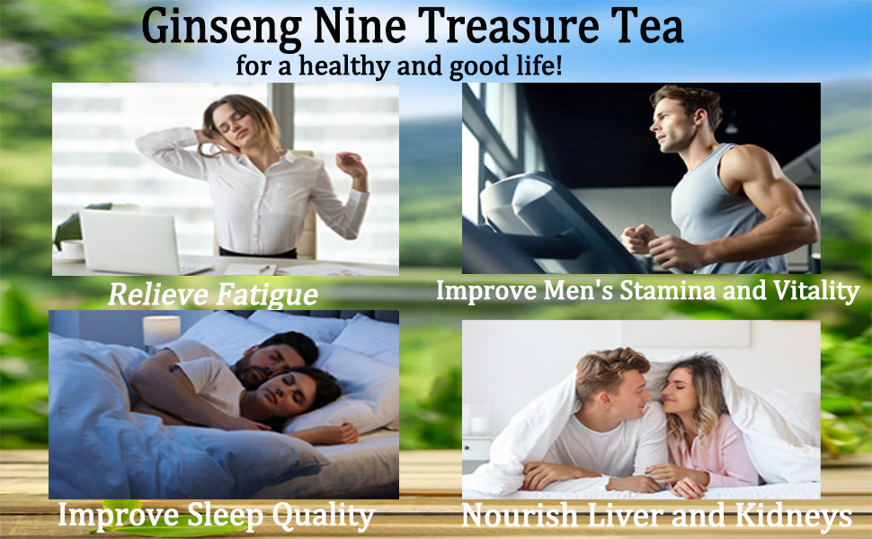 - Ginseng Five Treasure Tea Kidney Tea: Ginseng Five Treasure Tea is a good tea, which is suitable for people who always stay up late, like to drink or work fatigued, this ginseng 5 treasures kidney tea for men also has benefits for people who have been sitting or standing to work for a long time